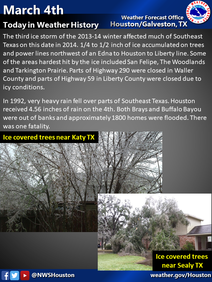 This 2014 storm left a mess. My wife and I had a wedding date for 4-26-14 for an outdoor wedding at my parents ranch in Cat Spring just southwest of Bellville. The Ice made a huge mess in downed trees and branches all over their property. It took all of the next month going up every weekend to get them cleaned up and burned so it looked worthy of a wedding. Id pass on an ice storm like that again.don wrote: ↑Fri Mar 04, 2022 10:08 am In the northern parts of southeast Texas and in central Texas there was a snowstorm in April 2007.For Houston the last time we had a winter storm in March was Today in 2014! LOL March 4th.I still remember that night there were widespread thunderstorms all night with temps hovering at freezing.
