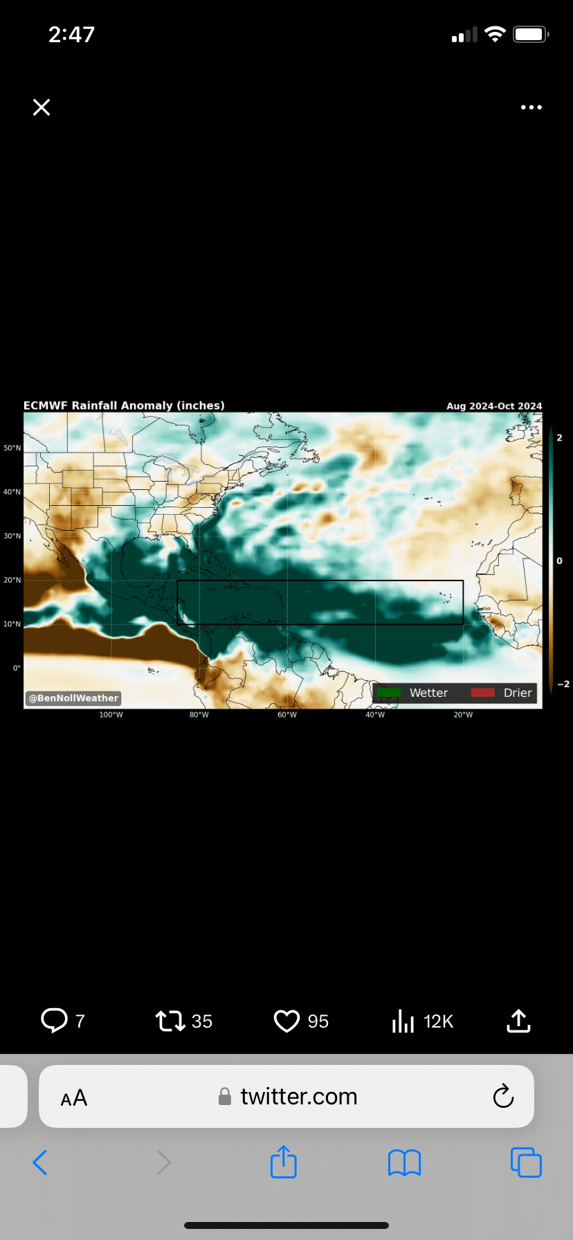 One thing to keep an eye on is if July gets wet or not. A wetter July is more correlated to see a hurricane to make landfall.don wrote: ↑Mon May 06, 2024 5:47 pm I'm starting to buy in more with the various forecast showing Texas being one of the hotspots this year. I am very concern with the persistent weakness that has been over the state the last month or so. The continuation of this pattern through May could cause a feedback loop, with saturated soils over a large portion of the state contributing to low pressure development. A wet summer looks to be instore due to this which is great news if you want a cooler and wetter summer. But that same weakness could allow storms to steer towards Texas...