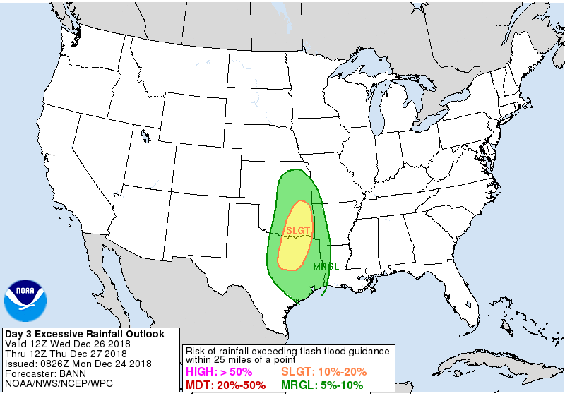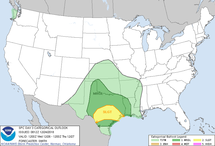 Merry Christmas everyone! Stay weather aware Wednesday afternoon into early Thursday. Severe Thunderstorms possible with damaging wind gusts and the possibility of a quick spin up tornado or two as a squall line forms along and ahead of a Pacific cold front in West Central Texas Wednesday evening and heads our way in the overnight hours into Thursday morning. Heavy rainfall is also a possibility with areas mainly along and N of I-10 getting 2 to 3 inches and those closer to the Coast, 1 to 2 inches. There is still some uncertainty with the storm track as the guidance has trended slightly more South into Northern Mexico and taken on a more negative tilt of the upper trough axis meaning greater dynamics. Stay Tuned!