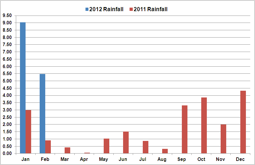 And I think you'd enjoy that about as much as I would. I made a graphic of my rainfall by month for last year through today. 9.03" in January and 5.47" so far this month, making a total of 14.5" for the year. Quite a bit more than last Jan/Feb. My yard really can't take any more rain.