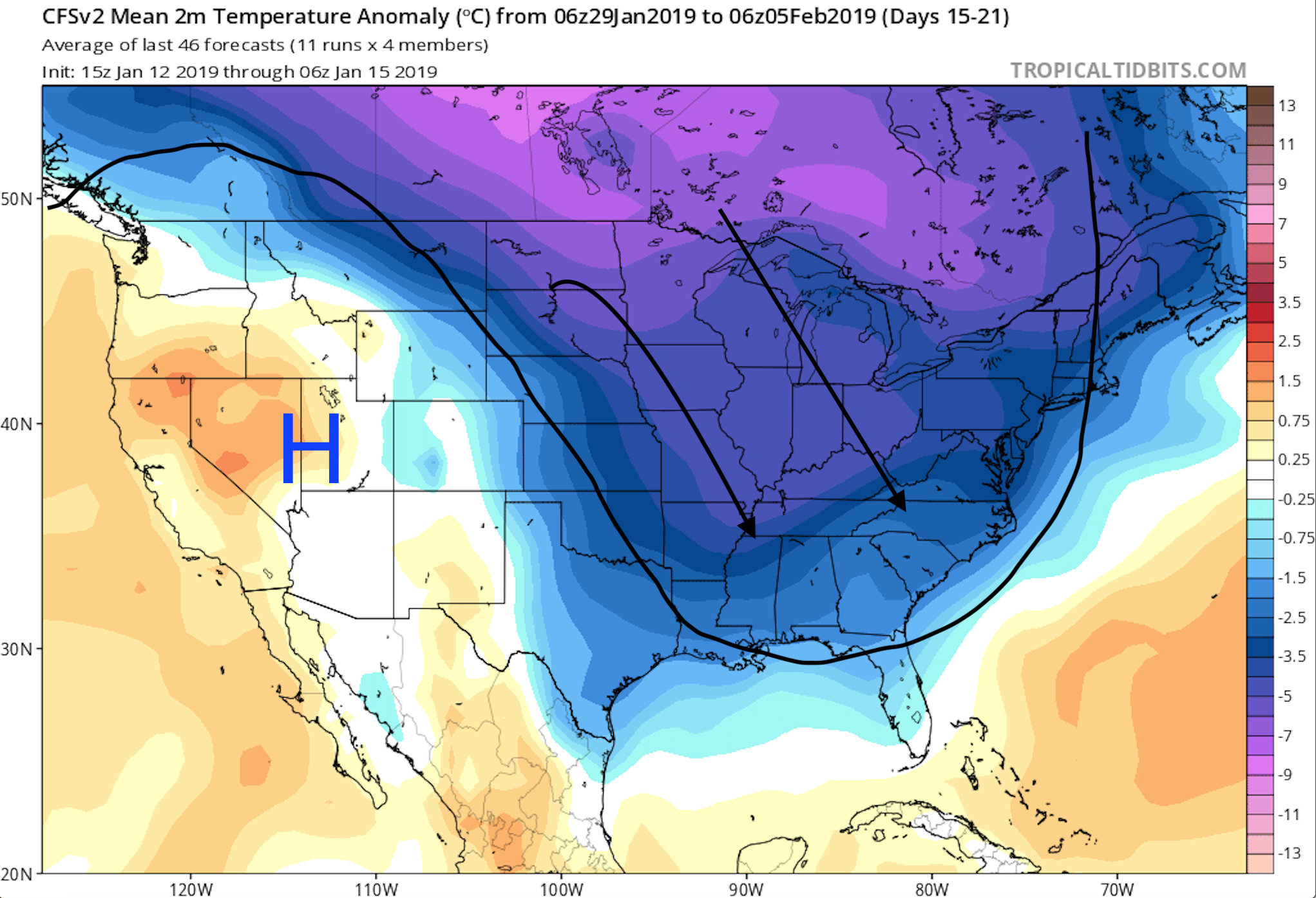 18z GFS op matches up well with the CFS map I posted earlier. Coldest anomalies headed straight south instead of east.