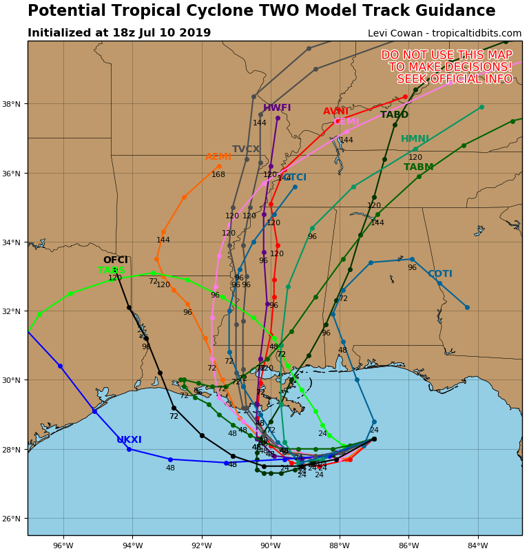 I posed a question earlier about the credibility of the HWRF, but this preliminary spaghetti plot lines up with what the 12z HWRF is showing. Looks like a decently potent Cat 1 for LA.srainhoutx wrote: ↑Wed Jul 10, 2019 3:17 pm 18Z Early track guidance...Official raises an eyebrow...