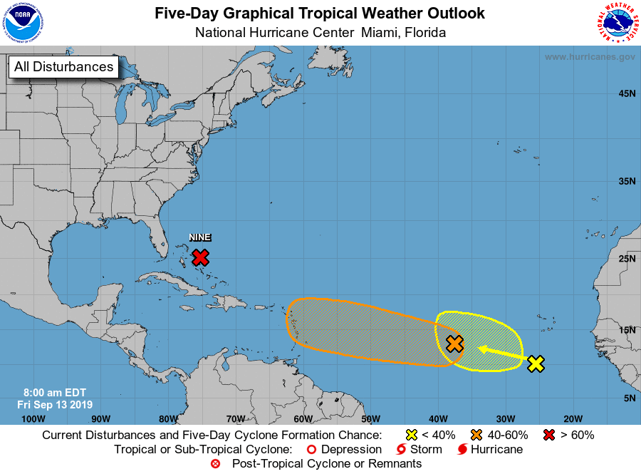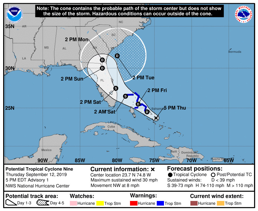 NHC will initiate advisories on Potential Tropical Cyclone Nine near the Bahamas at 5 pm EDT.