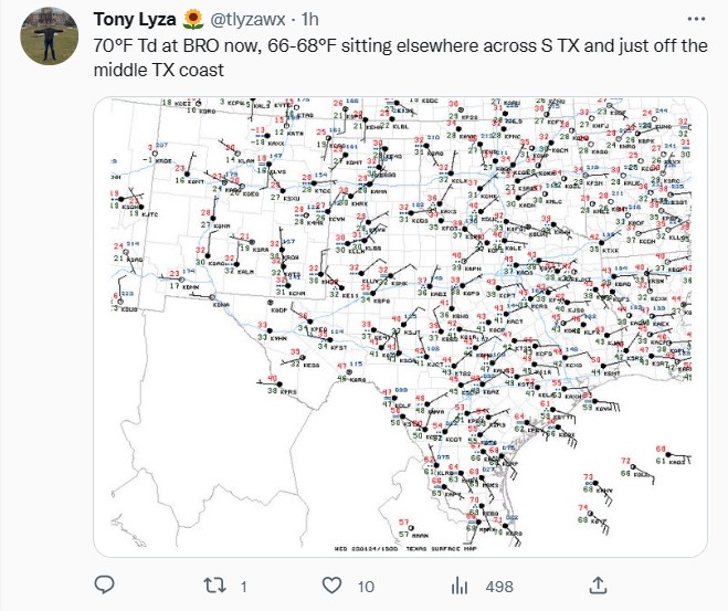 Highly impressive upper level storm system now over west Texas will bring numerous weather threats to Texas today. Strong lift is inducing pressure falls this morning over SC TX where a potent surface low will form and move ENE/NE across SE TX this afternoon. High resolution guidance shows “incredible” surface pressure falls on the order of 20mb in 6 hrs over our region today which will result in a very significant low level mass influx of deep moisture into the region. Current dewpoints are 58 at Palacios and 68 at Brownsville versus 39 at Livingston. As surface pressures tank, low level jet will quickly develop and transport mid and possibly upper 60 degree dewpoints from S TX to near the I-10 corridor this morning. Warm front looks to move through the coastal counties and at least into southern Wharton, Fort Bend and Harris with all areas along and south of this boundary likely primed for a robust severe weather potential.