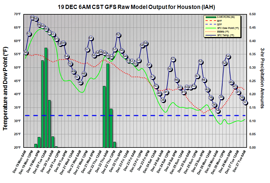 The forecast for next Sunday, Christmas Day, looks cool but uncertain. The models still differ between a chance of rain, and a lot of rain, with high temperatures in the upper 40s and lows in the mid-30s over Houston.