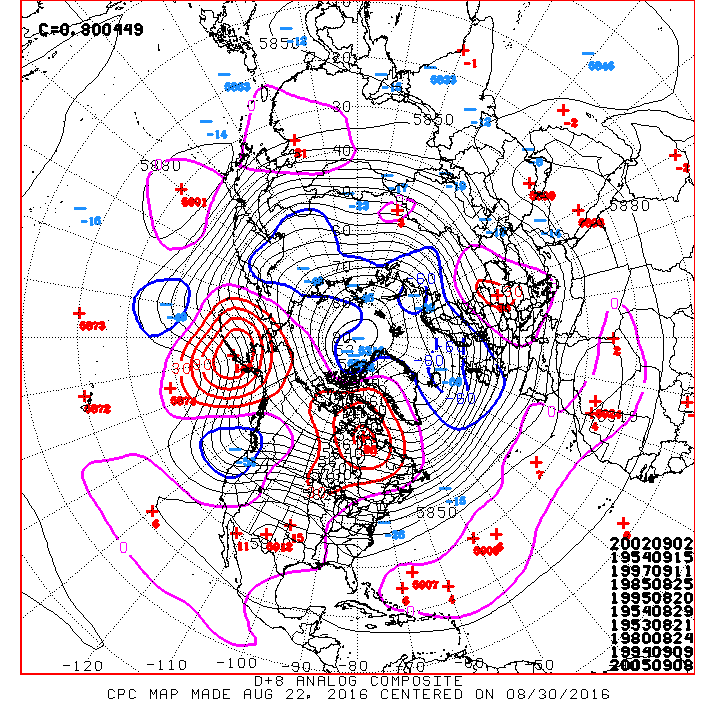 The afternoon Updated Climate Prediction Center Day 6 to 10 Day Outlook suggests more wet weather may be ahead for our Region and somewhat cooler temperatures due to increased cloud cover. It is interesting to note that the Subtropical Ridge is expected to extend into the SE United States and that may play an important role in the future track of INVEST 99L or potential TC Hermine, if it develops. The Day 8+ Analogs are posted as well.