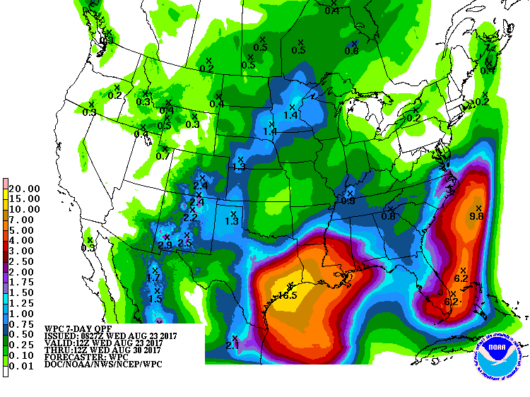 Conditions appear favorable for intensification of Harvey up to landfall on the TX coast. All parameters appear to be satisfied including warm SST’s, 200mb high pressure over the center of the system, potential dual outflow channels to the NE and SW of the center. It is possible that a period of rapid intensification could occur as Harvey nears the middle TX coast on Friday. Intensity forecast skills are poor especially when dealing with rapid intensification…this aspect will need to be monitored closely on Thursday and Friday as Harvey approaches. General consensus currently is for a strong tropical storm or weak hurricane into the middle TX coast Friday evening.