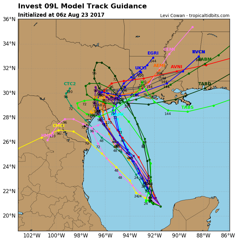 All high altitude data and special balloon launches from southern NWS offices went into the 00Z model data. There has been a very slight shift eastward (right) in the model consensus with a track near the western edge of Matagorda Bay possibly near Seadrift for a landfall. Looking at the last 4 cycles of models there is not been that much shifting of the consensus track of the major global models so confidence is starting to increase for a landfall between north of Corpus Christi to Matagorda Bay