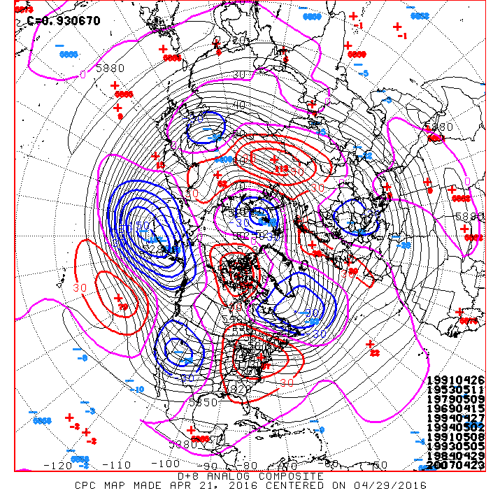 Getting a bit concerned regarding the sensible weather pattern expected as we end April and begin May. The Ensembles continue to advertise a Rex Block over Greenland somewhat similar to what we have seen since mid April. Typically such a pattern spells repeated rounds of severe weather potential and the possibility of Excessive Rainfall across areas that do not need any additional heavy rain. I am particularly watching late this week into the coming weekend where the Global ensembles are suggesting a potent upper cold core trough sending embedded impulses across Texas, Oklahoma, Arkansas and Louisiana. The Updated Weather Prediction Center Extended Outlook also is monitoring the potential which further raises an eyebrow.