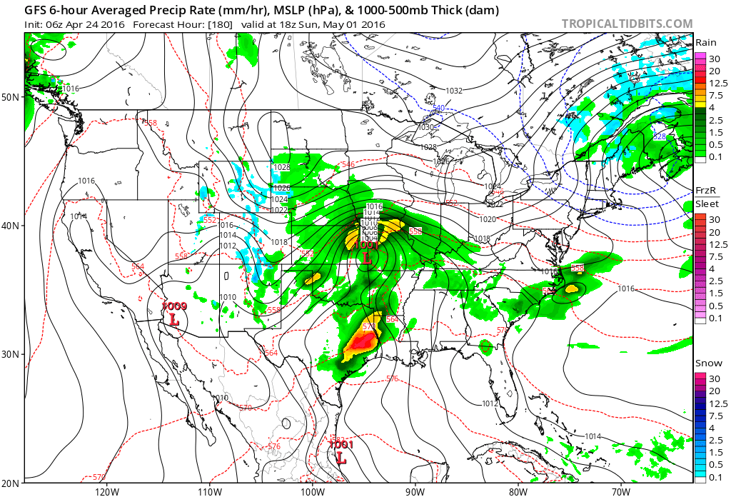 Looks like dry air will keep things mostly in check today, but we will be monitoring a series of storm systems dropping SE into the Great Basin and slowly ejecting E into the Great Plains. That said the GFS does raise an eyebrow as we enter May, but that's a new month and a new Topic.