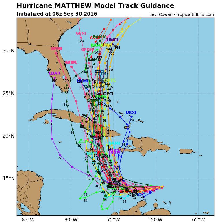Even with wind shear…Matthew has continued to become better defined and intensity overnight. It is likely that an inner core has formed…although the USAF mission will confirm this later this morning…and once such a feature is established rapid intensification is certainly possible. Not sure any of the intensity guidance has a good handle on the current intensity forecast and Matthew could be a significantly stronger hurricane than currently forecast as it approaches Jamaica late Sunday into Monday. The current NHC forecast is for Matthew to become a category 3 major hurricane early Saturday with the intensity holding steady up to landfall over Jamaica…however it would not be surprising if Matthew exceeds this forecast and becomes a very dangerous category 4 hurricane. Matthew is forecast to remain and large and powerful hurricane across Cuba and into the southern and central Bahamas.