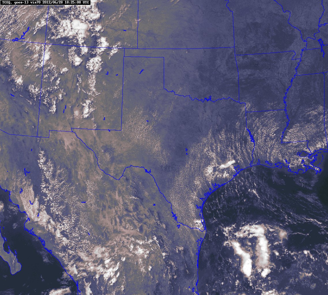 As is usual under such strong high pressure and weak wind fields, visible satellite images have shown a large mass of haze over the western and northwestern Gulf of Mexico and inland over much of TX. This is due to the fairly stagnant conditions that are common under large domes of high pressure in the summer months. This haze when combined with the daily pollution across the metro area will support high readings of ground level ozone this afternoon.