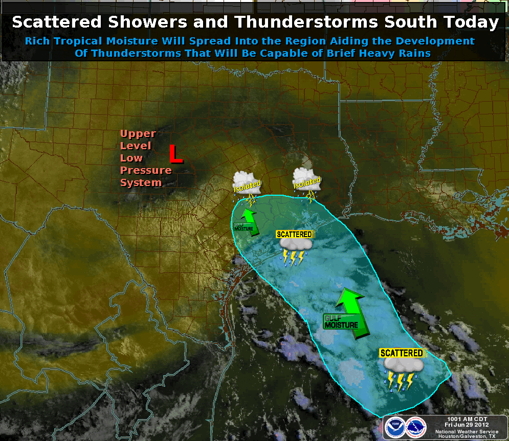 The 12Z WRF and RAP suggest the best rain chances today will be W of the I-45 Corridor, while the 09Z SREF is suggesting rains will spread a bit further E. It is noteworthy that the radar and visible imagery trends suggest a bit more Eastward spread of the heavier storms along the Middle Texas Coast as the upper low meanders over N Central Texas. Tropical funnels have already been reported near and just W of Matagorda Bay as well.