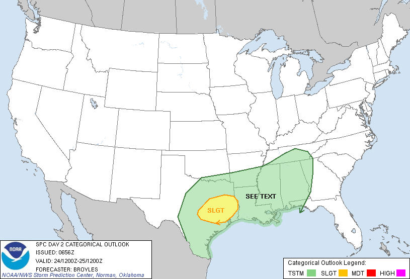 Folks in Central/SE Texas need to monitor Christmas Eve and into the early morning hours of Christmas Day. The SPC has issued a Slight Risk for Day 2 (Christmas Eve) for portions of Central/SE Texas with a possible stronger threat on Day 3 (Christmas Day) during the early morning hours where the SPC currently has a Slight Risk outline from SE Teas on E into Southern Louisiana and Southern Mississippi. There is a potential that a Moderate Risk may be issued Christmas Morning/day in future SPC updates. This is a very dynamic Winter Storm with both Winter and Severe weather. Stay Tuned and Keep Informed!