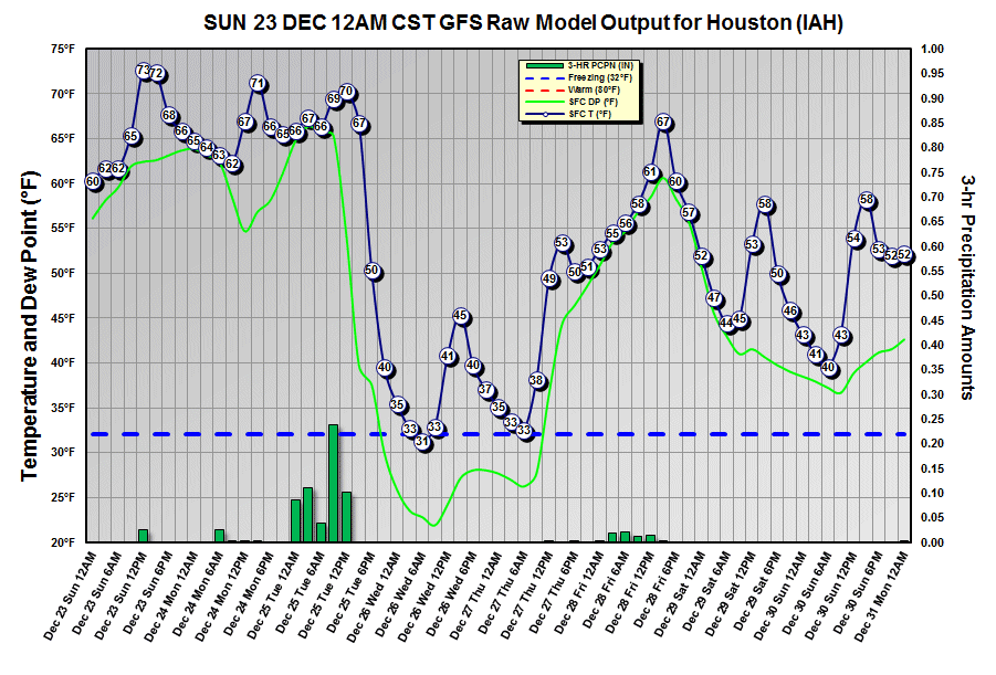 Here's a meteogram from the latest GFS. About 0.75 to 1" of rain during the day Christmas. Cold front moves through around mid afternoon, bring an end to the rain. Temps fall rapidly after frontal passage. Light freeze Wed/Thu then a warm up.