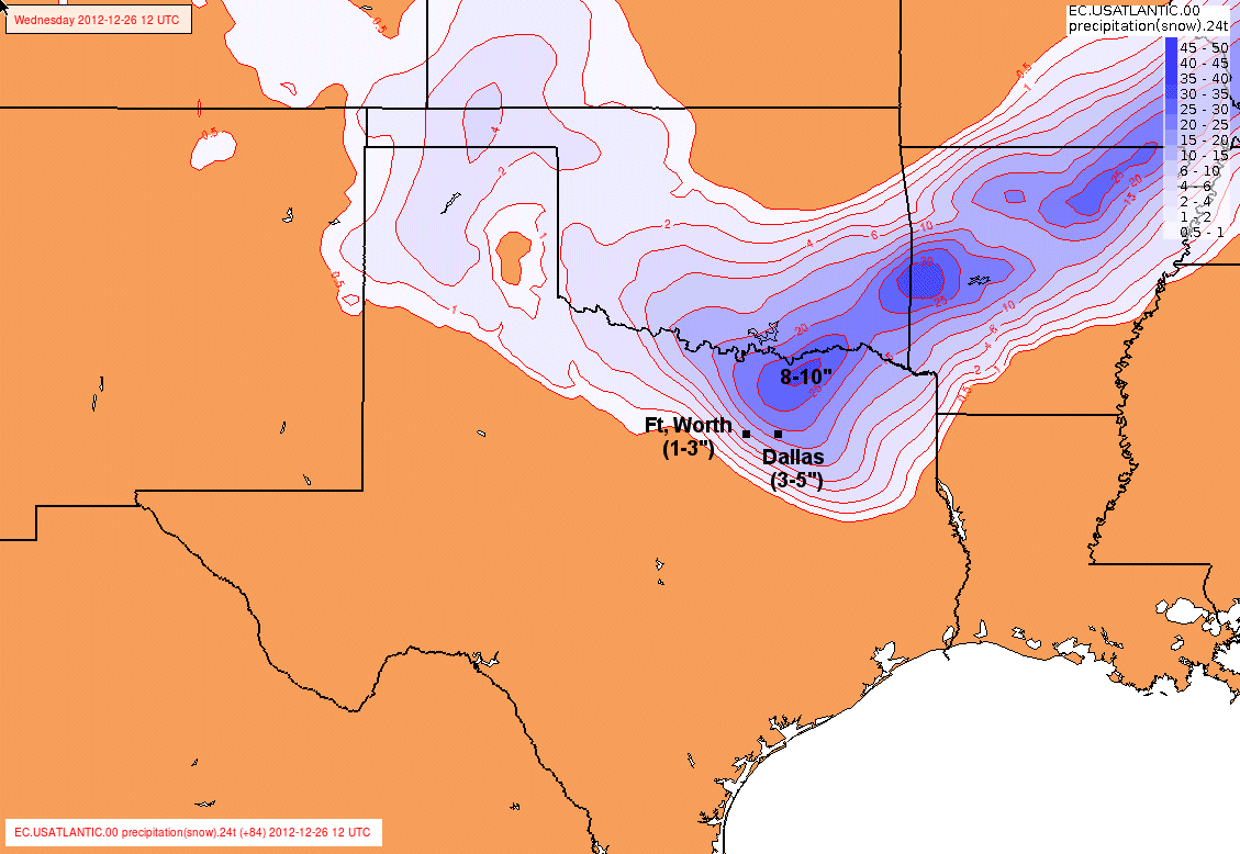 GFS keeps the snow in OK but the Euro is farther south, dropping 3-5" snow in Dallas between noon and 6pm Christmas Day: