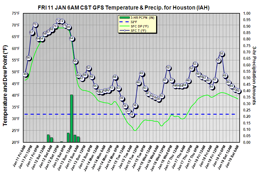 12Z GFS certainly brings some more cold air out of Canada this weekend and across Houston early next week, as indicated in the first meteogram below. Highs in the upper 40s Mon/Tue with a possible light freeze next Tuesday morning. Gradual warm-up to follow. Another cold shot the following week (second graphic below) around the 21st and a possible light freeze the 23rd. No indications of any extreme cold across SE TX.