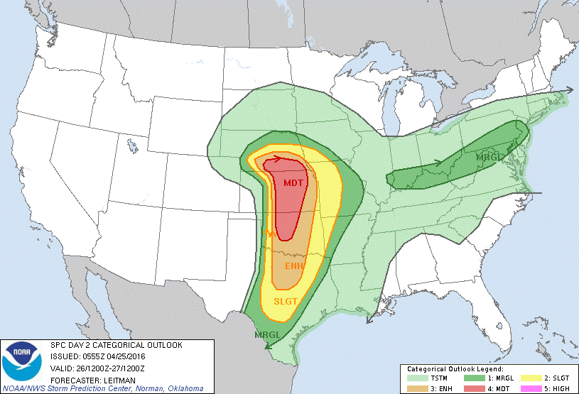 I would not be surprised either. This is Spring, which is most likely to see large severe weather outbreaks.Andrew wrote:Tomorrow I suspect the plains will see a rather large severe weather outbreak. Whether that will be a strong wind event or a tornado outbreak is still up to debate. What I do suspect will happen is the moderate risk will continue to expand further south. Models indicate that the influence of a vort max and associated LLJ will impact North Texas/ Southern Oklahoma right around 00z. This area could also provide a cleaner mid level wind profile when compared to Central Oklahoma. We see much more of a veering profile versus a veer-back-veer setup. Furthermore, storms that far south may stay more discrete longer instead of going fully linear. With that said, if we see a high risk I suspect that will occur over Kansas/Nebraska region where the triple point will help focus convection. Still have my reserves if that will actually happen though with a potentially delayed vort max/ messy mid level winds.