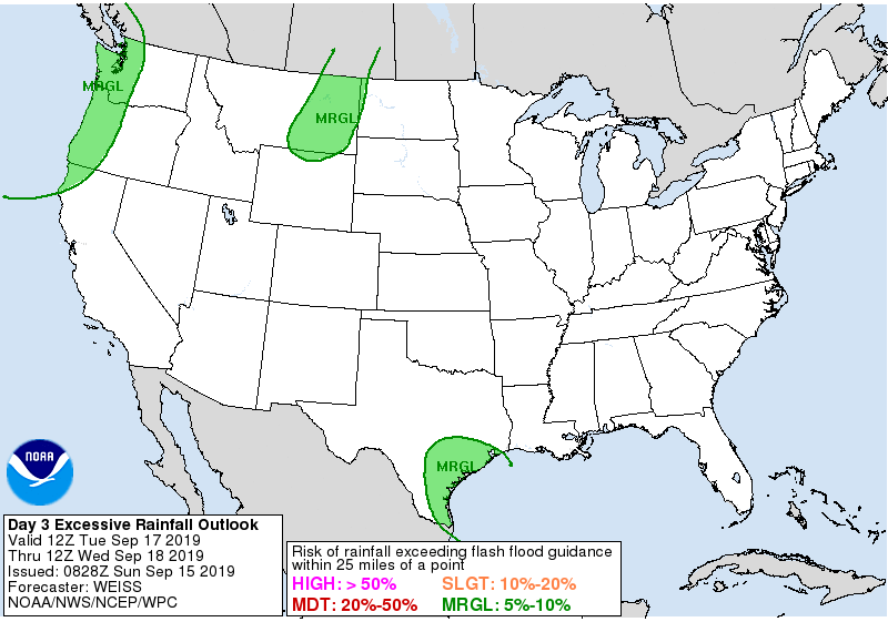 Radar looks a bit more active this morning offshore and I believe there were SPS issued around 4 AM along the Coastal tier of Counties. The Weather Prediction Center 5 Day QPF chart is still hopeful regarding our rain chances through at least mid week and we do have a Marginal Risk for Excessive Rainfall on Tuesday and Wednesday. Oh and a still see no sign of a strong front heading our way through the end of September.