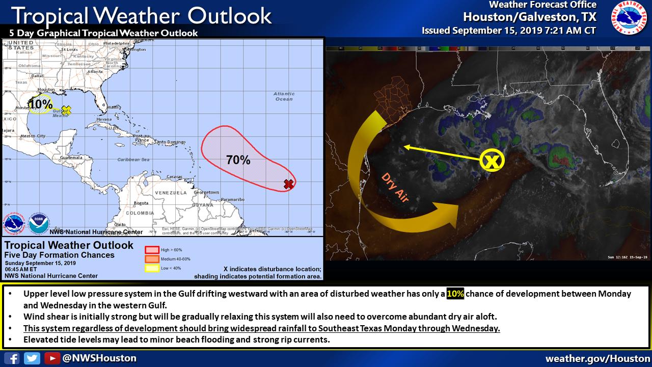 Tropical weather outlook...Gulf system chances have diminished to 10% for development. But it should bring much needed rainfall to Southeast Texas Monday through Wednesday.