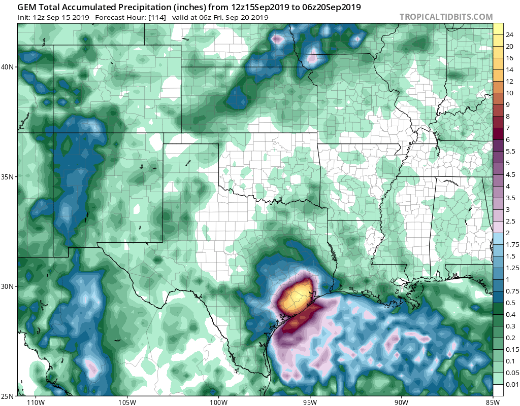 Canadian weights in with a foot of rain. ICON slides east of I-45. GFS west of HOU with the largest bolus of rain.