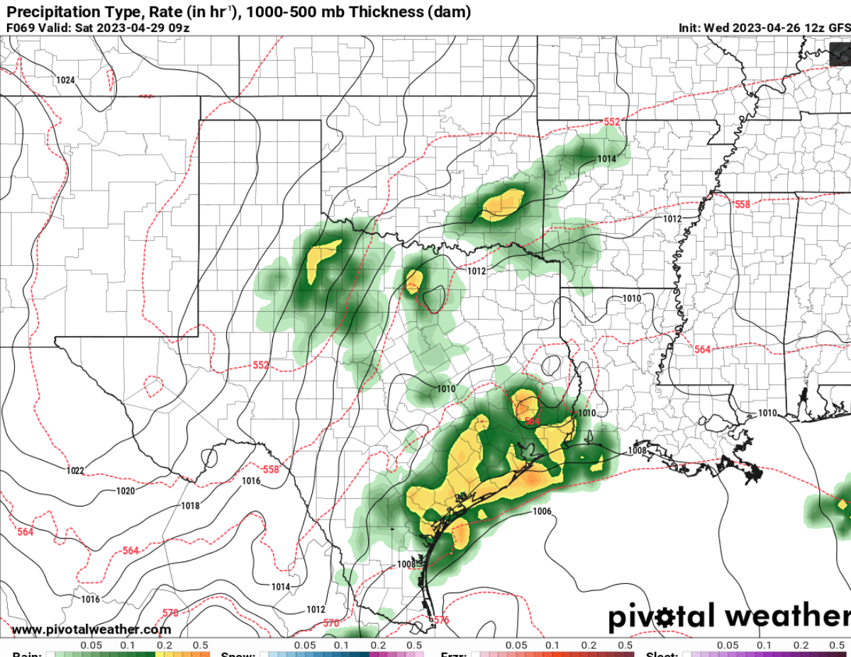We need to watch this Friday/Saturday for a potential localized heavy rain event as a MCS moves in and a coastal trough/ low develops.There is still some disagreement on where the heaviest rains setup as some models have the heaviest rain in South Texas instead.But something to keep an eye on.(12Z GFS)