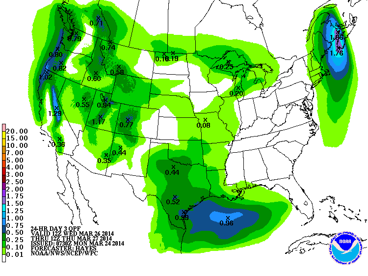 The mid week time frame continues to offer our next shot at rain/storm chances. The 00Z Euro is about 6-8 hours faster with the upper air disturbance currently offshore of California ~vs~ the GFS with that feature crossing Texas and the Southern Plains on Wednesday into early Thursday. The NAM is still a bit too far out to be trusted, but it also is suggesting a dry line and showers/storms developing and moving E to NE. The big concern is if the cap can erode and if we can get some breaks in the clouds for destabilization across Central Texas Wednesday afternoon. the QPF amounts are not that impressive as of this morning, but the SPC is suggesting that portions of the Central/Southern Plains into the Ozarks may still see some severe storms, but not enough consistency in the guidance to offer a highlighted risk area at this time. We will see.
