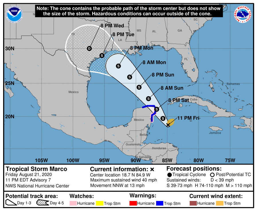We would literally be in unprecedented territory. A forecasting nightmare...txbear wrote: ↑Fri Aug 21, 2020 10:42 pm West and west we go. Even though it’s not near the magnitude of the first dramatic shift, NHC ever so slightly nudging to the left on the map.