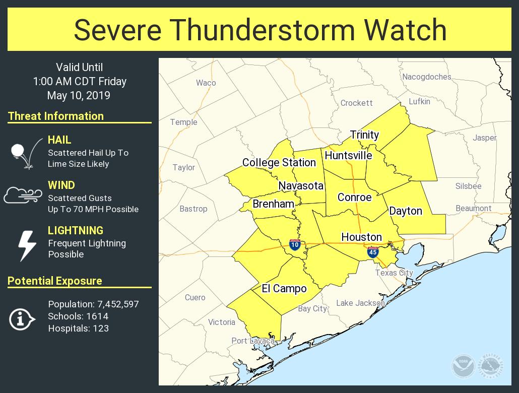 Severe Thunderstorm Watch coming for all SE Texas areas except for the Coastal Counties and the Counties farthest North until 1:00 AM CDT