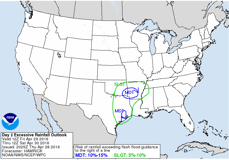 The Weather Prediction Center as outlined a large area of East, SE and NE Texas, West and NW Louisiana as well as portions of the Southern half of Arkansas with a Moderate Risk for Excessive Rainfall.