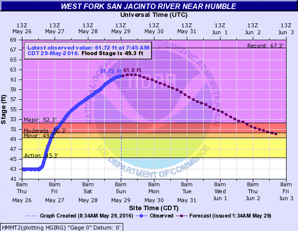 The river crested yesterday afternoon at 61.9ft which appears to be the second highest crest only behind the Oct. 1994 flood. The river has fallen overnight to around 60.2 ft. Flood stage is 49.3ft. Major flooding will continue today into Tuesday with many subdivisions cut-off and water in areas where flooding does not occur often including portions of Humble and Kingwood. Improvement will be slow.