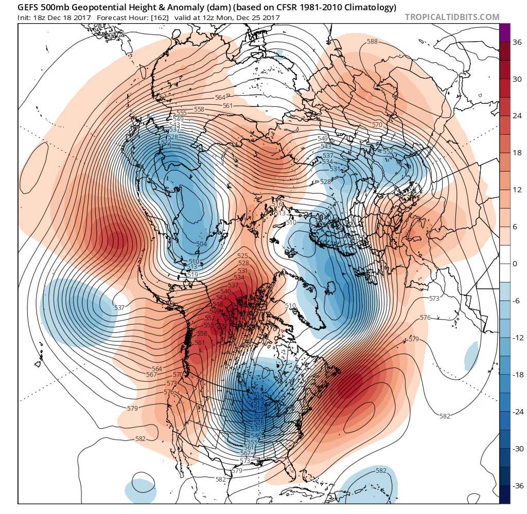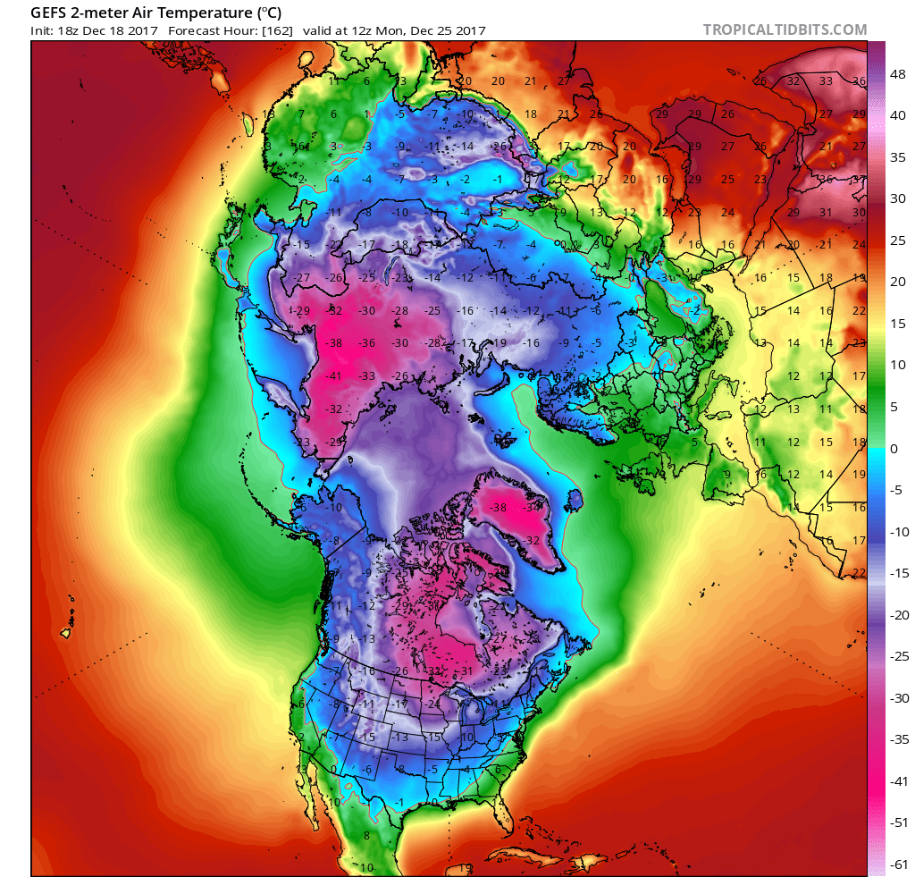 The 18Z GEFS suggests a very impressive Omega Block to our NW tapping into some chilly Siberian Air. That's one heck of a longwave trough across Central North America and temperatures (in Celsius) look mighty chilly compared to what we have experienced the last couple of Christmas's.