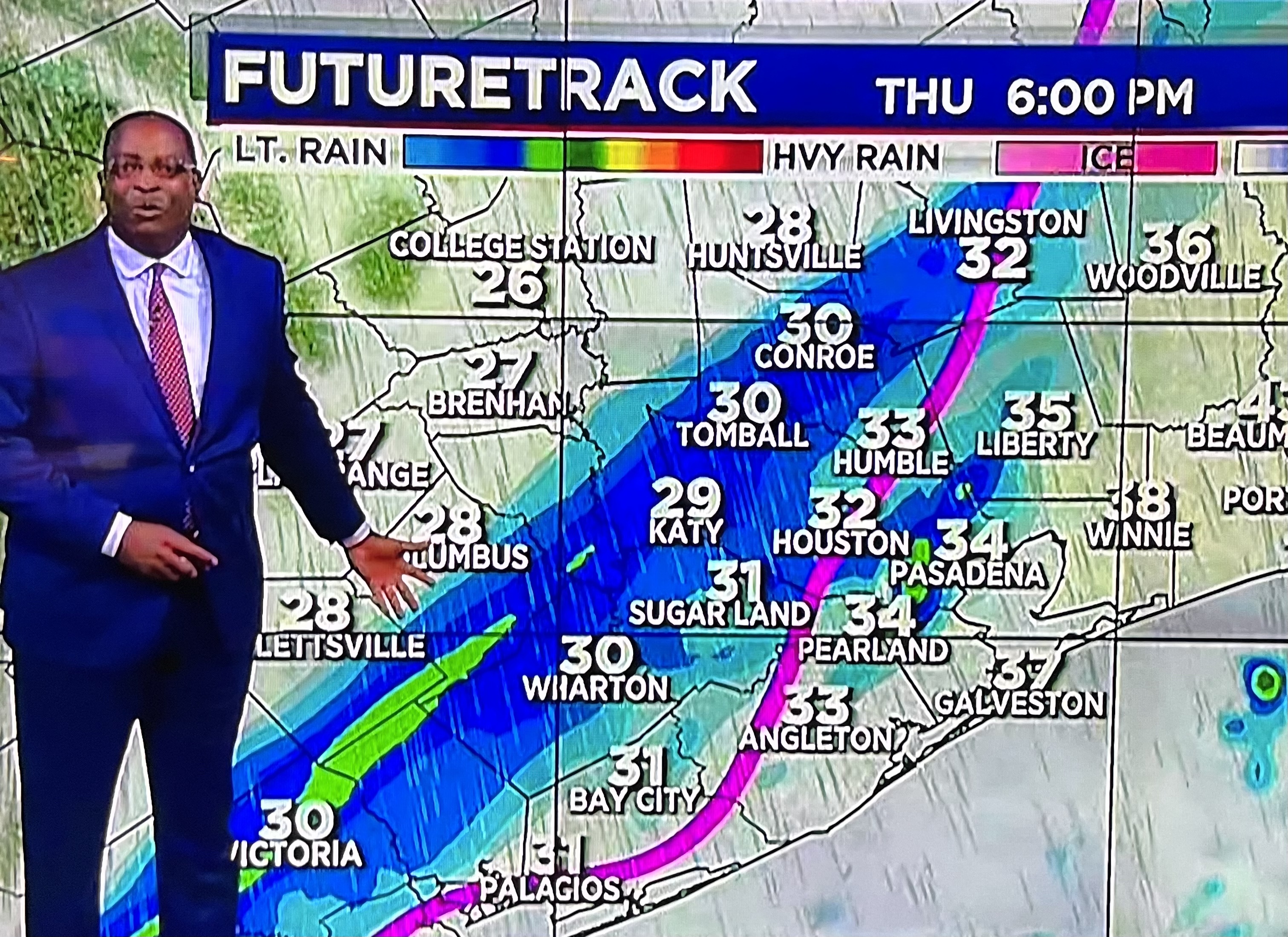 Channel 2’s Justin Stapleton just showed their futurecast and said if it holds we could be looking at snow bursts and sleet across Houston. Added we could start to see some “light accumulation” overnight Thursday into Friday morning with a “likely fairly messy commute” Friday morning.