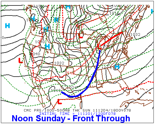 Yep, Canadian has the front reaching/passing Houston by noon Sunday (see below). But it stays just offshore until Monday evening. Quite similar to the GFS. May not get any sun through Wednesday. Could see a high in the mid 40s on Monday with light rain. Maybe low to mid 40s for the high on Tuesday.