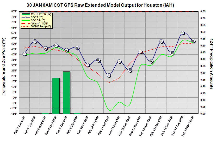 Meanwhile, here's a meteogram based on that 12Z operational GFS run. Low of 21F at IAH on the 11th with a dew point of -12F. High in the upper 30s (21Z vs. the 00Z temps shown on the graphic).