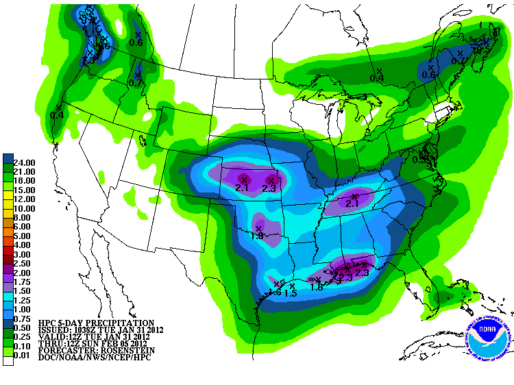 Check back on Wednesday. The guidance is still not offering a sensible solution regarding the late week storm system. The HPC still suggesting a very low confidence forecast for the upcoming weekend. That said it does appear a stalled boundary will linger near the area on Sunday with over running conditions possible as a weak upper air disturbance swings through Central Texas. We will see. It also appears a decent Winter Storm will lay down some snow across the Plains setting the stage for things to come later during the 2nd week of February...;)