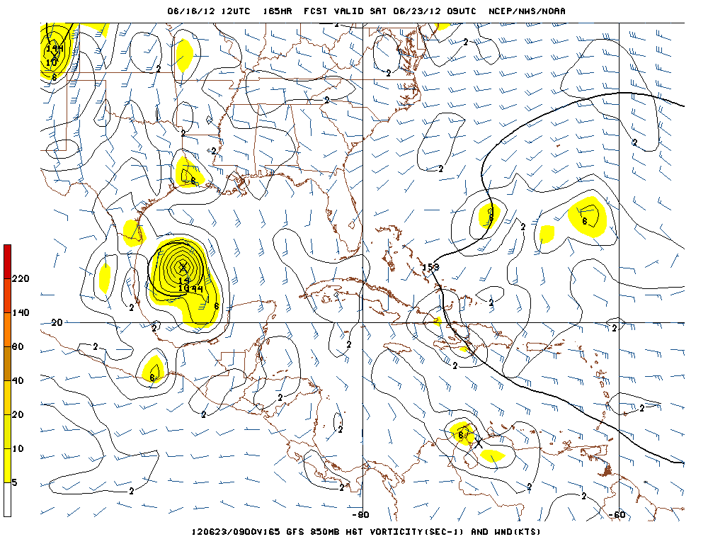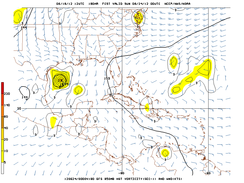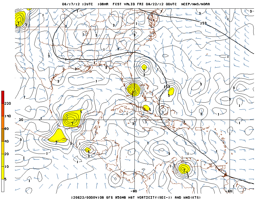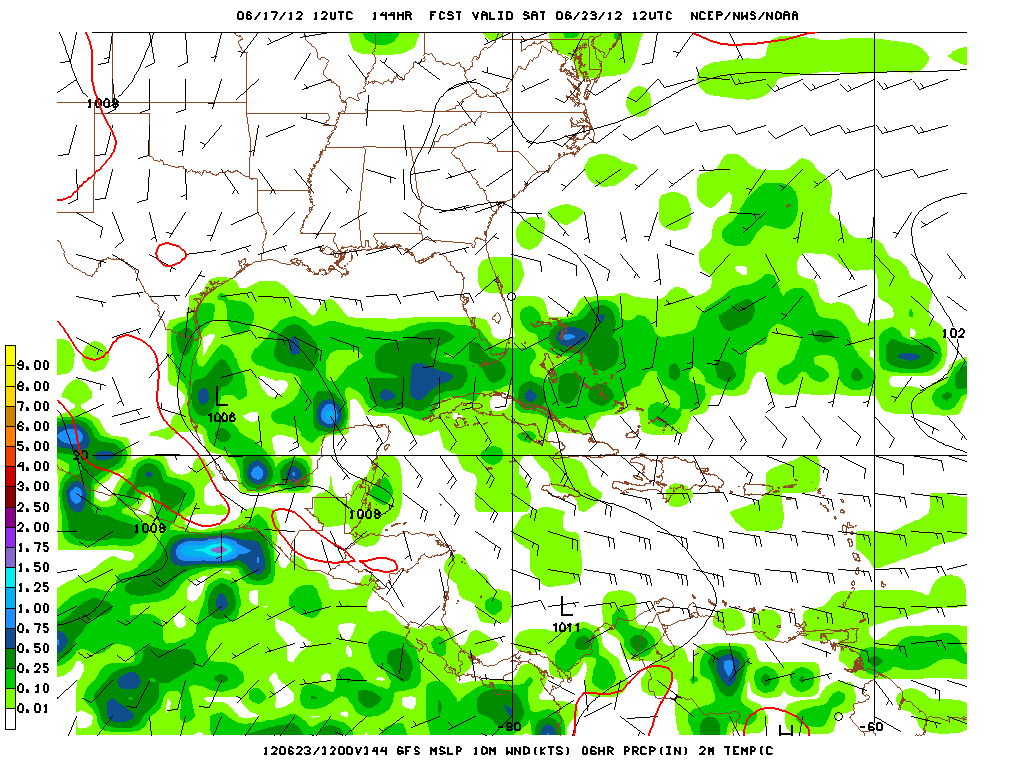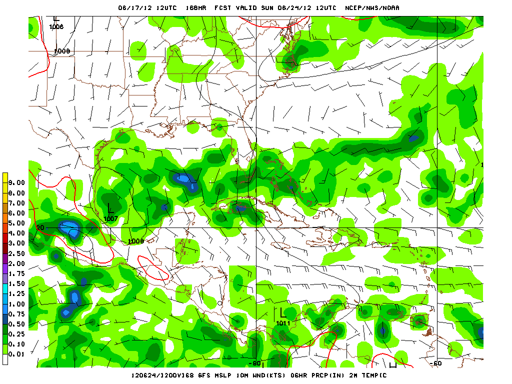 There is some speculation that the sole feature involved in developing the Bay of Campeche disturbance is the weak low pressure in the Western Caribbean. The models have been rather insistent that this will be a combination of events that include left over mid level vorticty from Carlotta in the EPAC crossing the Isthmus of Tehuantepec and the Western Caribbean wave of low pressure slowly consolidating into a broad surface low embedded with the monsoonal trough. The 12Z GFS suggests this today as well.