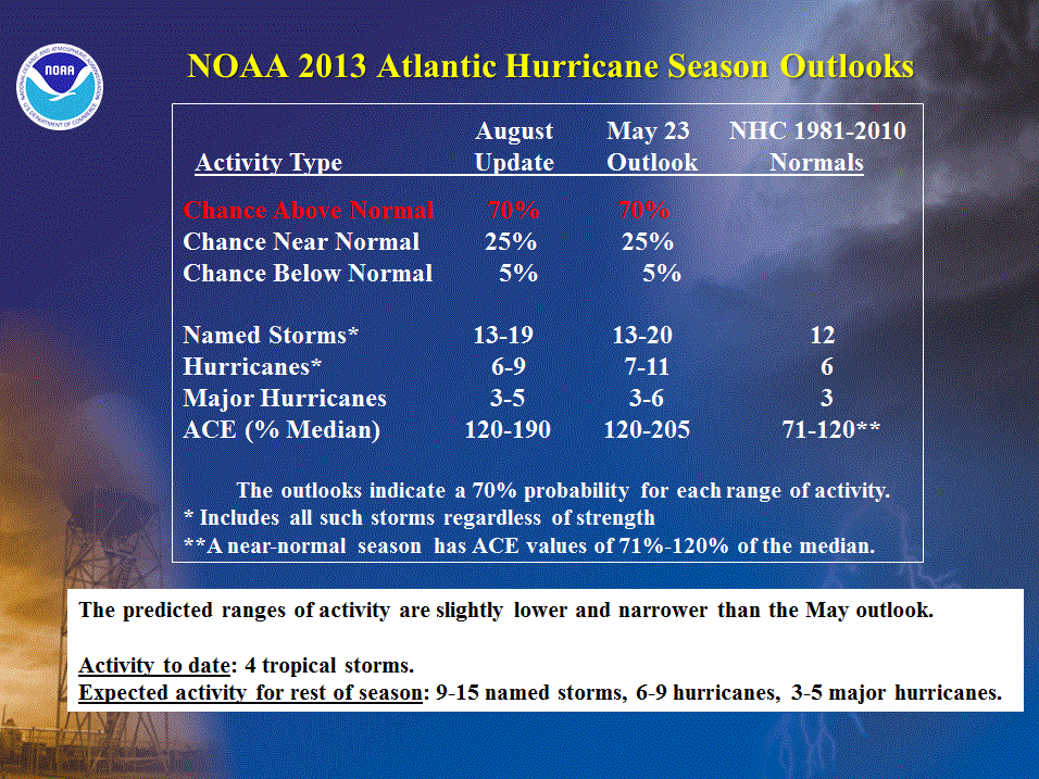Climate signals and evolving oceanic and atmospheric conditions, combined with dynamical and statistical model forecasts, continue to indicate a high likelihood (70% chance) for an above normal 2013 Atlantic hurricane season, with a reasonable possibility that the season could be very active (i.e., hyperactive). The outlook also indicates a 25% chance of a near-normal season, and only a 5% chance of a below-normal season. See NOAA definitions of above-, near-, and below-normal seasons, which have been slightly modified from previous years.