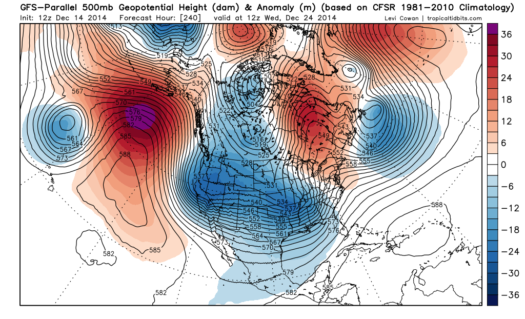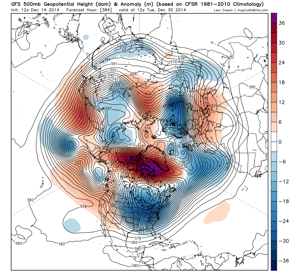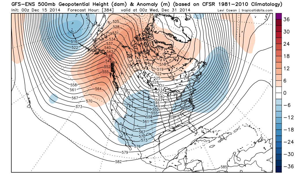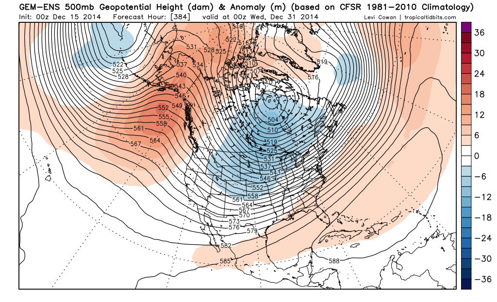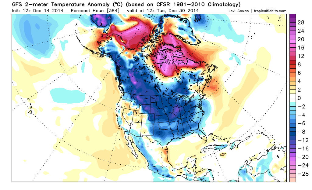 srainhoutx wrote:The 12Z parallel GFS suggests an impressive 1056mb+ Arctic High pressure cell dropping S from Western Canada in the longer range solutions. The 12Z GEFS ensemble mean and temperature anomalies agree that most of the Lower 48 into Mexico will plunge into a very cold pattern almost Coast to Coast.