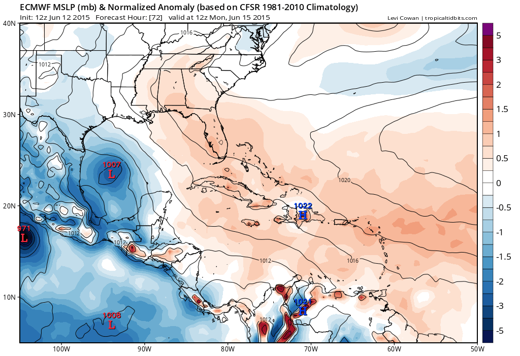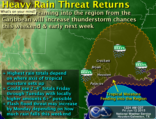 The overnight guidance continues to advertise a rather complicated and complex upper and lower level pattern emerging this weekend into early next week and possibly throughout most of the upcoming work week. Deep tropical moisture has been pooling across the NW Caribbean Sea and the Southern Bay of Campeche. Satellite derived data suggests PW's around 2.3+ inches are expected to begin lifting into the Western Gulf and reach the NW and Northern Gulf Coast around Friday and continue throughout the weekend into early next week. There are several features that should allow for the development of tropical showers and storms to increase during this time frame. A shear axis or the differential between the ridge to our East and a flattening ridge to our West increases the SE flow off the Gulf at the surface while a weakness between the two ridges develop aloft. The fly in the ointment will be two features upstream. A trough is expected to dig into Northern Mexico into the Southern Plains by Sunday into early next week. Newly formed Tropical Depression 3E is expected to slowly meander toward the Pacific Coast of Mexico and turn WNW skirting near the Coastline spreading mid and upper level moisture across Mexico. As the trough deepens to our West, the upper level winds may turn to a SW to NE flow aloft sending mid and upper level moisture into the Southern Plains and Texas early next week. Pressure falls are indicated across the Bay of Campeche and the Western Gulf continuing the long fetch South Easterly flow at the surface bringing additional tropical moisture toward the Texas and Louisiana Coast. Embedded disturbances in the SW upper flow from what may be Hurricane Carlos in the Eastern Pacific looks to spread along a frontal boundary across New Mexico, West Texas and the Panhandle into Oklahoma and on NE. The GFS and Euro have come into somewhat better agreement suggesting the upper ridge building across the SE United States may not push as far West as previously modeled leaving a weakness across the Lone Star State. These various features along with embedded mid upper level disturbances could provide the ' trigger' for heavy tropical showers and thunderstorms capable of dropping very heavy rainfall rates where they occur in the 2 to possibly 4 inch per hour range. The combination of all these features is why we are seeing the various National Weather Offices mentioning the possibility of heavy rainfall and possibly localized street flooding issues. Add to the mix any meso features that cannot be determined beyond 6 to 12 hours in advance and you have a recipe of forecasting challenges and uncertainties. It does appear that the benign dry pattern of the past 11 days is coming to an end and we will be back into Weather Watching mode again.
