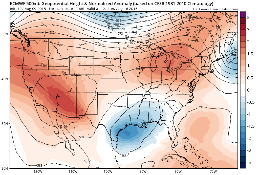 The operational and ensemble guidance are in good agreement suggesting an Westward moving upper low/shear axis will develop across the Northern Gulf Coastal States moving toward Texas and finally shift the pesky upper ridge West bringing lower temperatures and increasing shower/storm chances around this time next week. Fingers crossed!