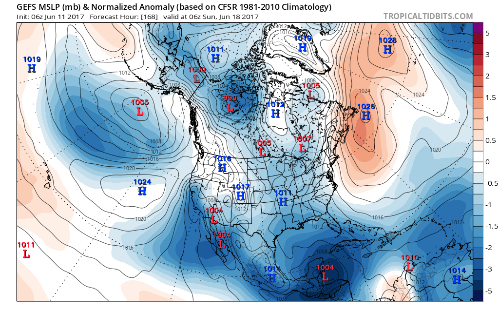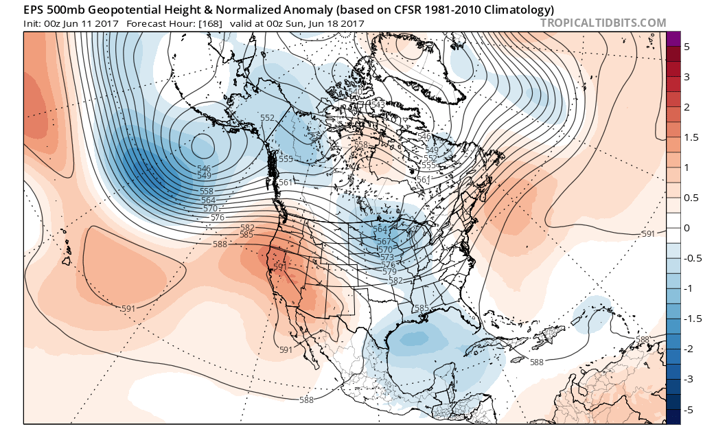 Focus continues to be in the longer range period from roughly the 18th of June onward with now several global forecast models including the GFS, ECMWF, CMC, NOGAPS, and many of their ensemble members developing a large monsoon circulation over the western Caribbean Sea/central America after the 19th. It will be important where this feature actually forms, if at all, as to what chances of development it may have. One important factor that continues to show up in the 500mb height fields is a general weakness over the NC Gulf of Mexico and trough axis across the Great Lakes into the Ohio Valley. As mentioned above upper level ridging never really builds across the US Gulf coast over the next 2 weeks which may leave the door open for any possible tropical development to migrate northward. In fact the latest ensemble clustering has shifted northward away from central America and into the SE/S Gulf of Mexico over the last few runs with a general average position of a very large low pressure system somewhere near/N of the Yucatan between the 18th and 23rd of June. This is all still way out in model la la land…but the increasing consistency is something to watch.
