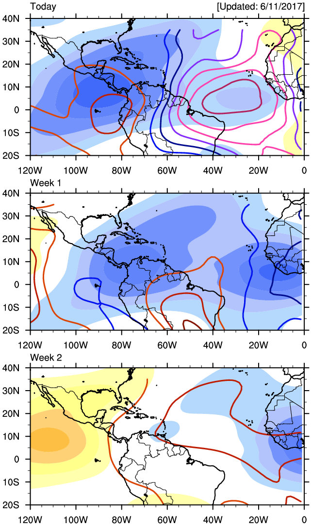 As Scott mentioned, we are seeing signs that the monsoonal trough with several broad spurious low pressure systems attempt to organize out of the monsoonal trough slop as it lifts North from. Central America. Typically these disturbances are slow to develop, if they do and can be prolific rain makers.