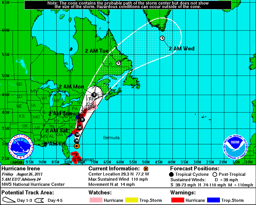 No change with the 12Z operational GFS and Euro. Those models suggest a major hit from NC to New England. Inland flooding and surge into Long Island and the Delaware Valley look very likely if Irene tracks as expected.