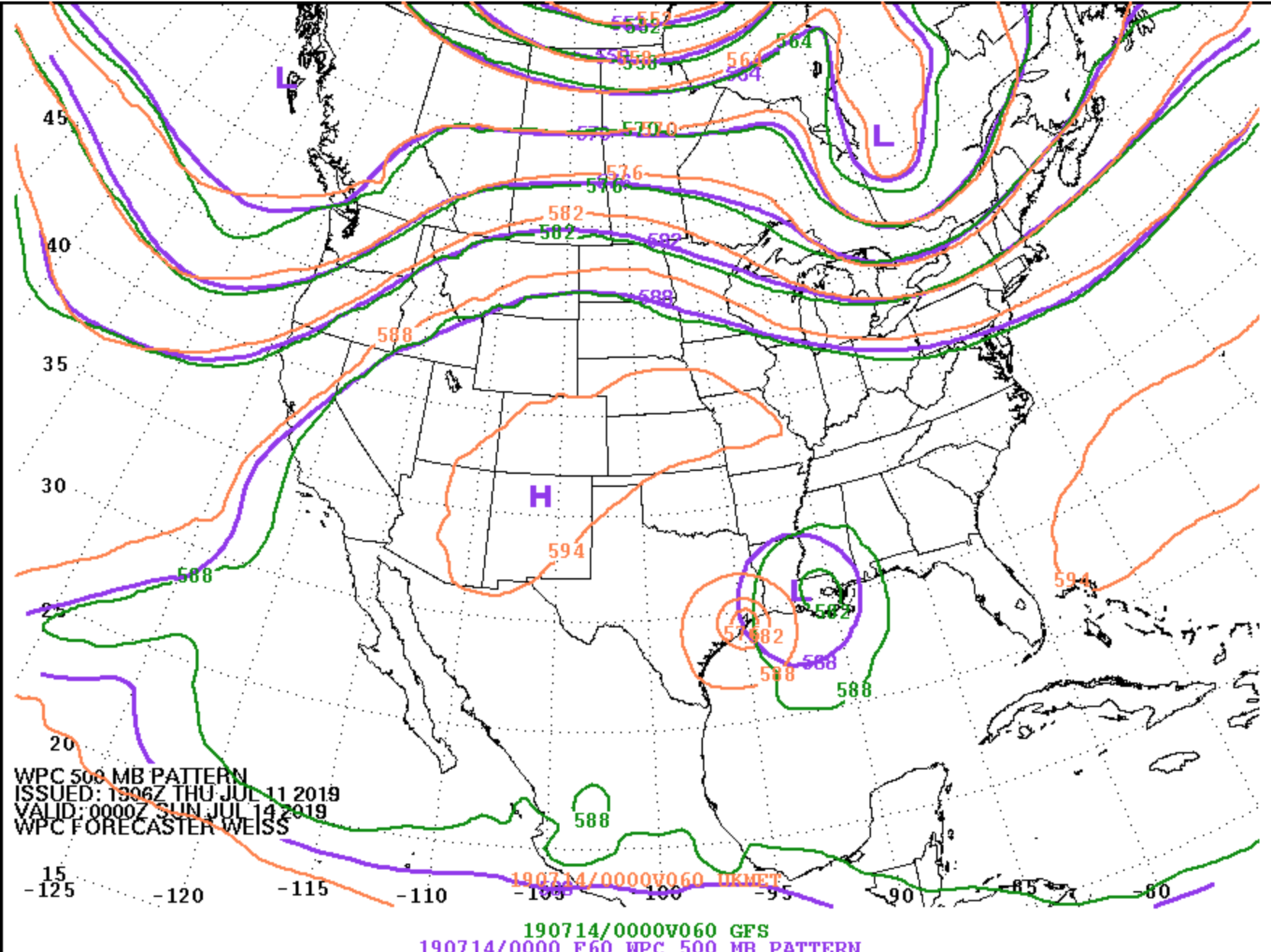 Thank you for sharing Andrew. We appreciate that. Our Met 101 class for the day.Andrew wrote: ↑Thu Jul 11, 2019 3:22 pm So far all who are wondering why the UKMET keeps pushing it west, it all has to do with upper-level ridging over the Rockies. Below, I have attached an image with the WPC forecast (purple), GFS (green), and UKMET (orange) all plotted for 60 hours out. Notice how strong and extended east the ridging over the Rockies is. No other model (including the WPC forecast) shows a 594 dam ridge from the Rockies to the SE U.S. This is what will need to be monitored over the next day to see which model is closest to the actual solution. To see this type of disparity this close to landfall is actually very amazing.
