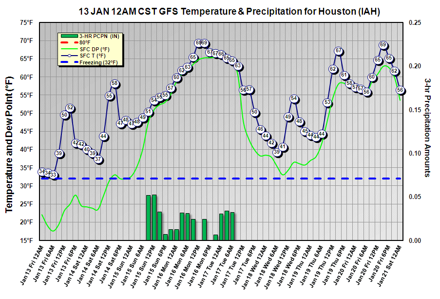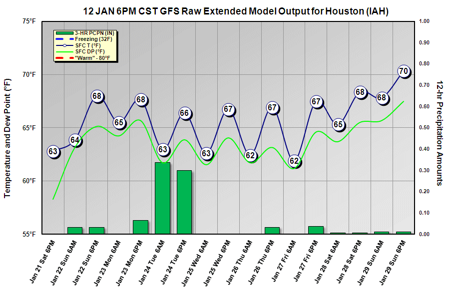 Enjoy your cold weather yesterday and today, because that may be the coldest we see in January (at least). Here are a couple meteograms from the overnight run of the GFS. On the extended GFS, note that temps are only given for 6am and 6pm, so the afternoon highs will be 3-5 degrees warmer than what would be observed at 6pm. I was hoping for a bit warmer temps in the extended, but 70s is better than 50s.