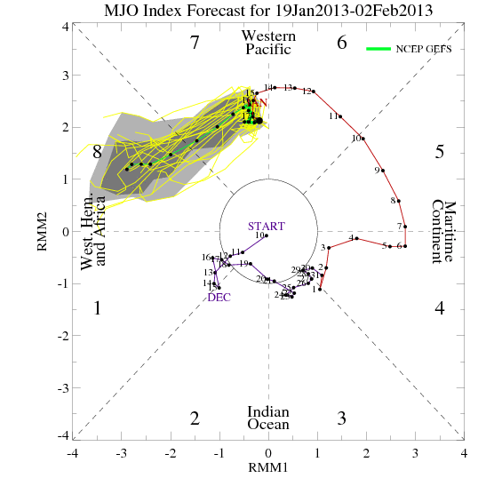 While it is too soon to know with absolute certainty that the pattern will reload our source regions across Eastern Alaska/Western Canada, there is strong indication that the MJO will play a much more active role and create the potential for a very noisy Sub Tropical Jet as it moves into phase or octant 8. As has already been posted in the February thread, cold air and a noisy SJT may well be established during the early part of February which is prime time climo wise for our Region for all sort of wintry mischief potential. We will see.