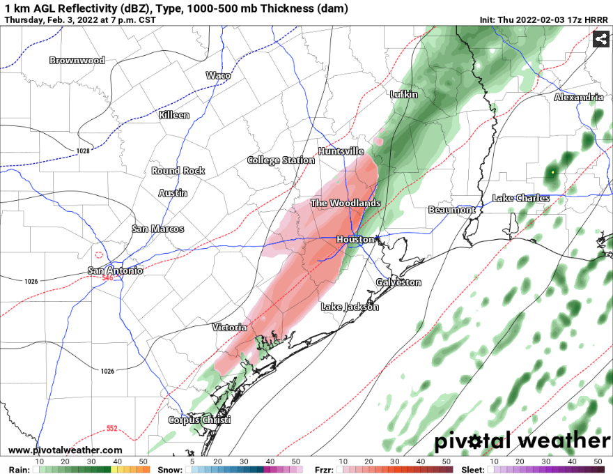 Thanks to a big break in the rain over the last several hours, the dry wind has been able to evaporate most of the water that fell on local roadways last night. Most of us are still well above freezing, but the freeze line is now in Southeast Texas about 60 miles northwest of Houston. Freezing rain and sleet are being reported in places like College Station and Brenham. The freeze line is on track to reach the western half of Houston and Harris County by 6PM.