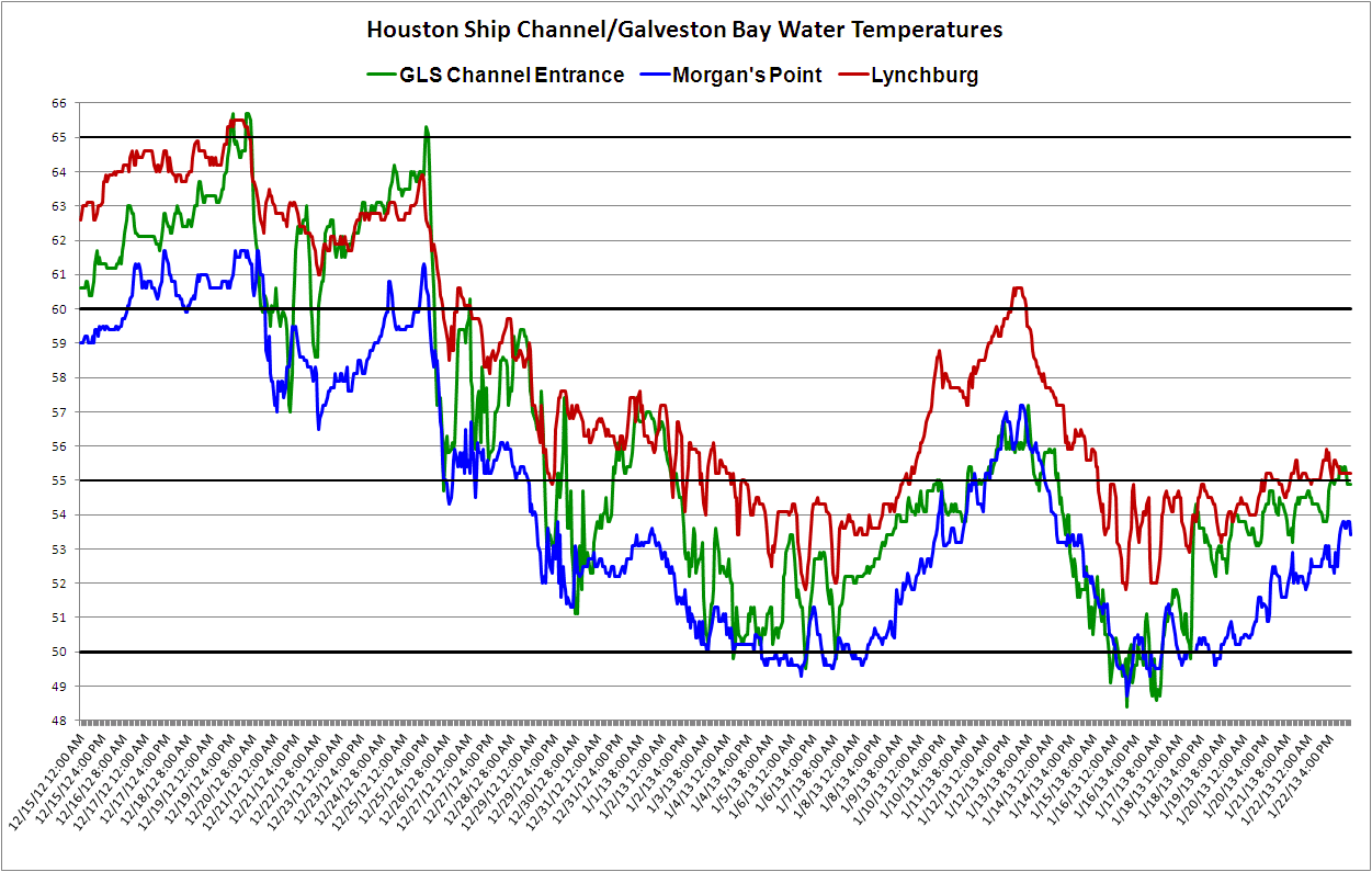 The graphic below is a plot of water temps at 3 locations in the ship channel. The channel entrance near the northern tip of the island, Morgan's point - which is the entrance to the Houston Ship Channel in NW Galveston Bay, and Lynchburg - the northern part of the channel.