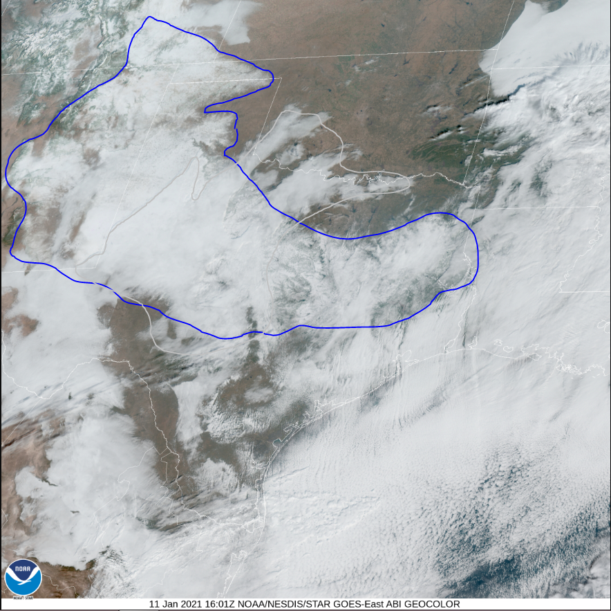 Low clouds (outlined in gray) beginning to diminish and the snow swath appearing on Satellite imagery (outlined in blue). As you can tell the track of the system brought snow across a good section of Texas.